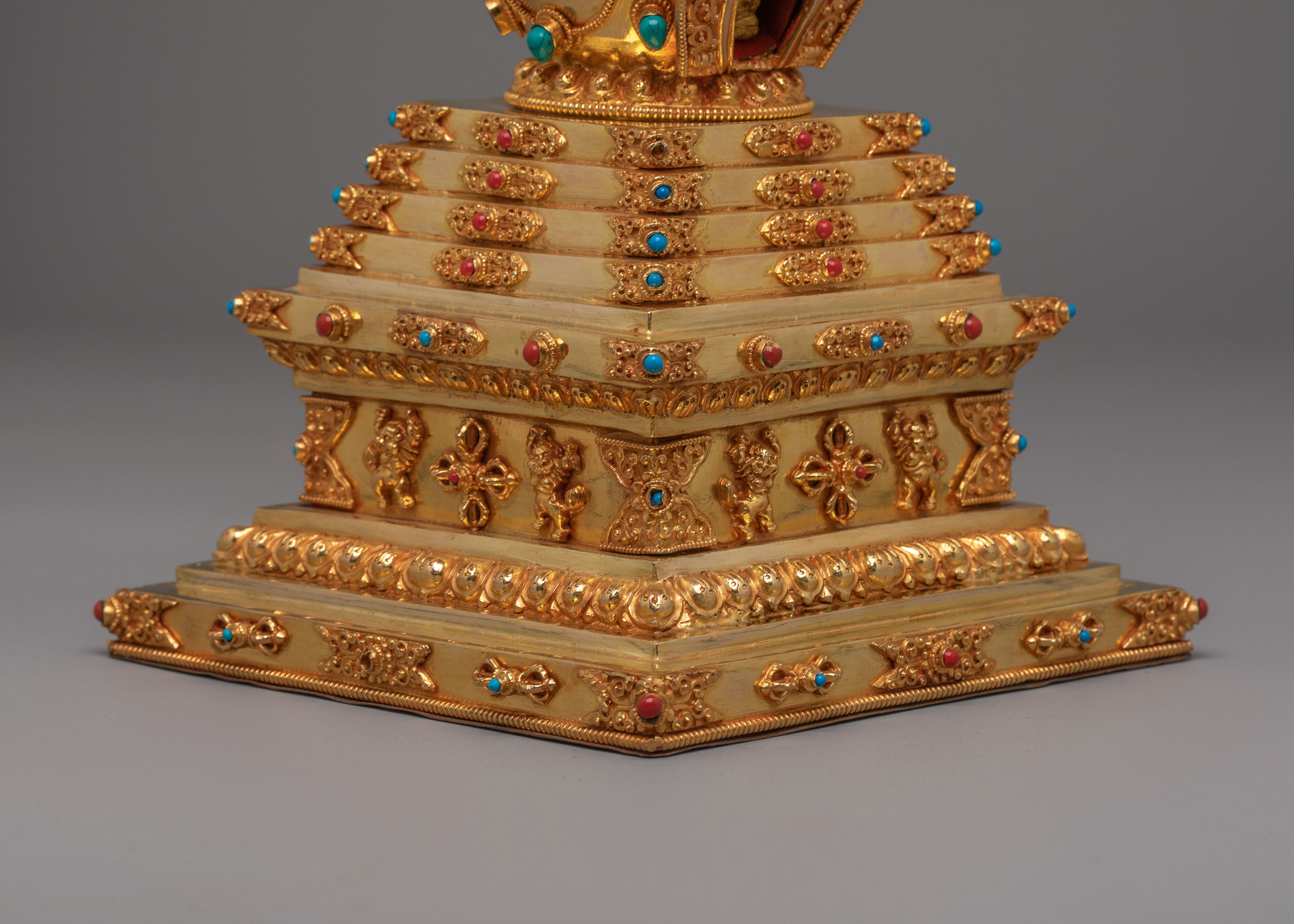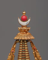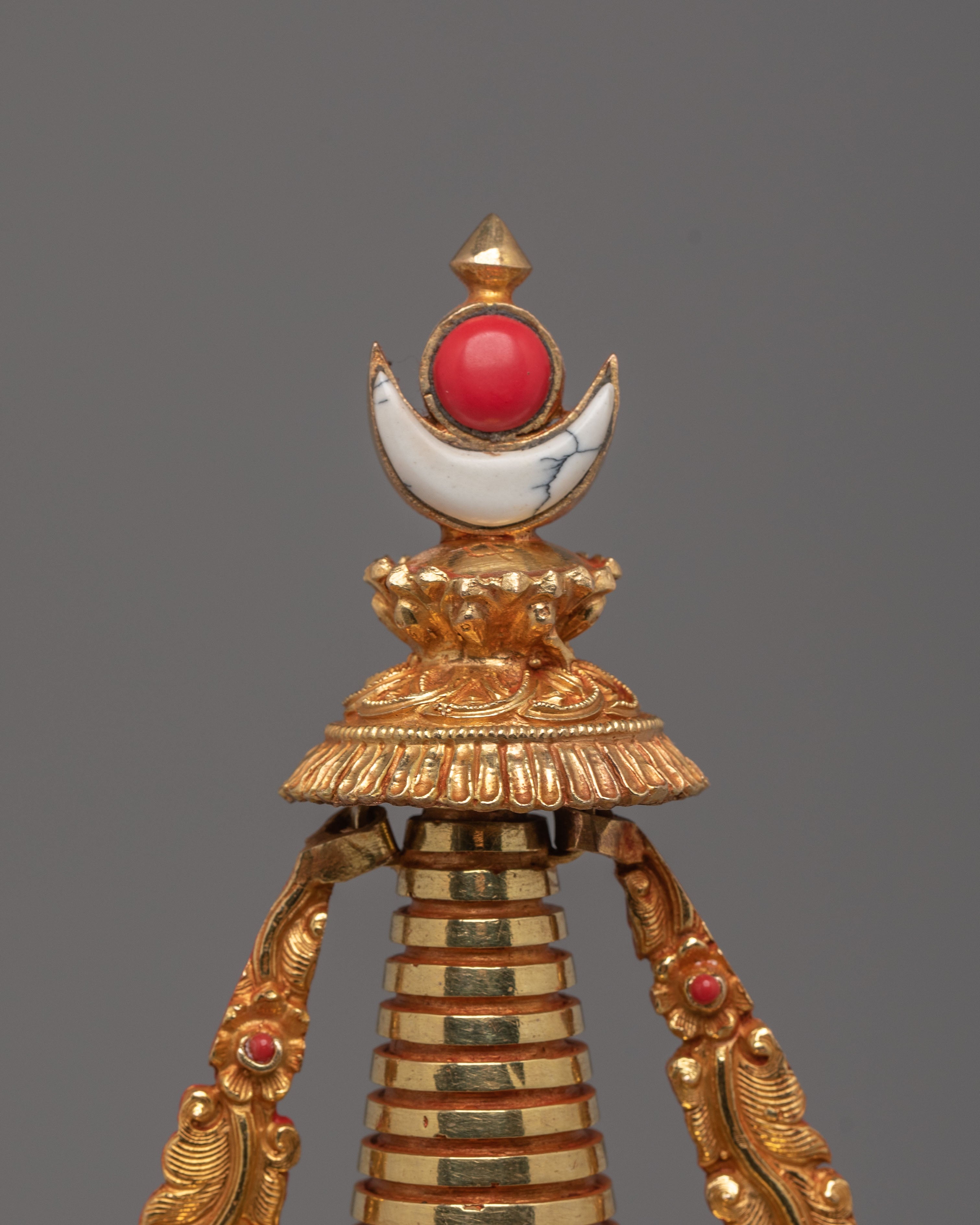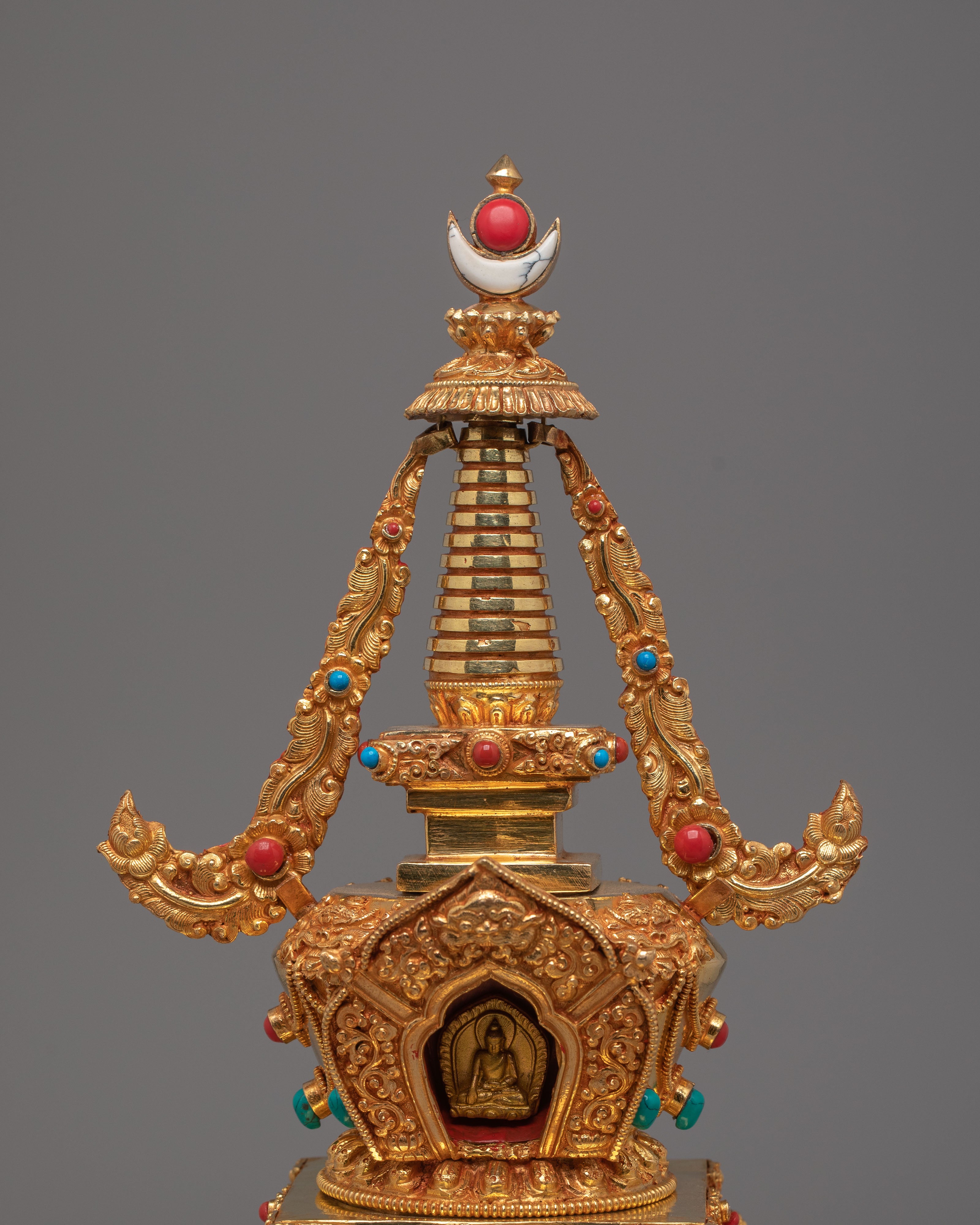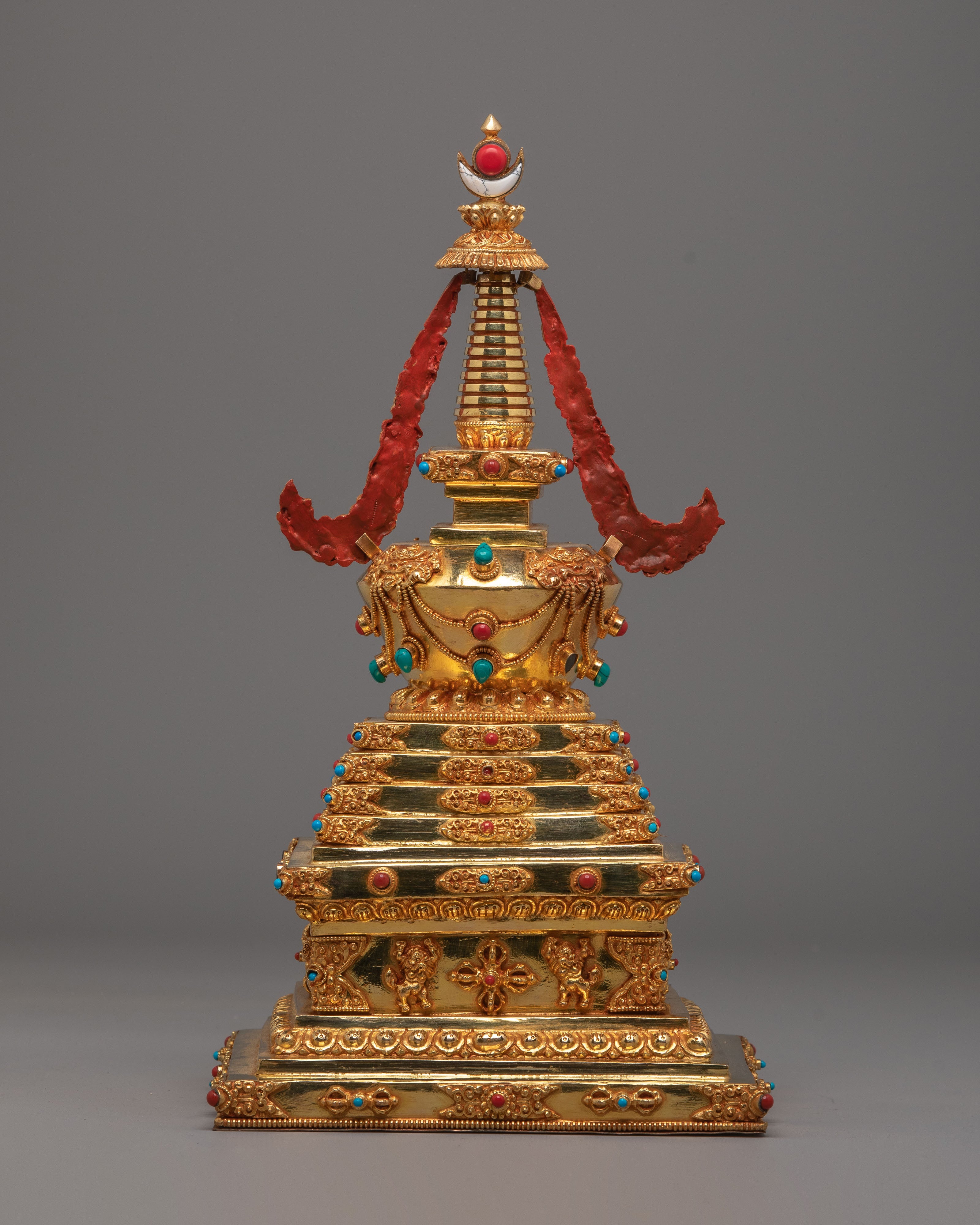 This Himalayan Ritual Stupa is designed to represent the path to enlightenment, serving as both a meditation tool and an ornamental piece. The sacred motifs and beautiful detailing reflect the spiritual journey, inviting peace and serenity into your environment. The gold-plated copper construction brings out the stupa's sacred energy, while the coral and turquoise stones enhance its spiritual presence.