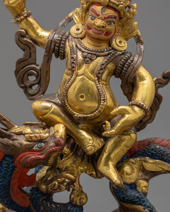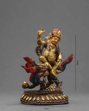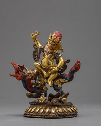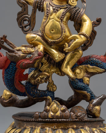 We have traditionally crafted the fascinating wrathful statue of Dzambhala or Jambhala in an oxidized copper body and gold platings with acrylic paint. We designed a god with a wrathful look in this statue.