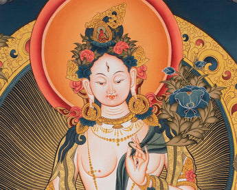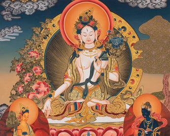 Our thangka is a Buddhist art that can help you for positive energy and peace. In our thangka, Arya Tara is placed at the center, visibly making stand out in her radiating white body. She is flanked by two other Maha Boddhisattvas, Arya Manjuhree and Arya Vajrapani.