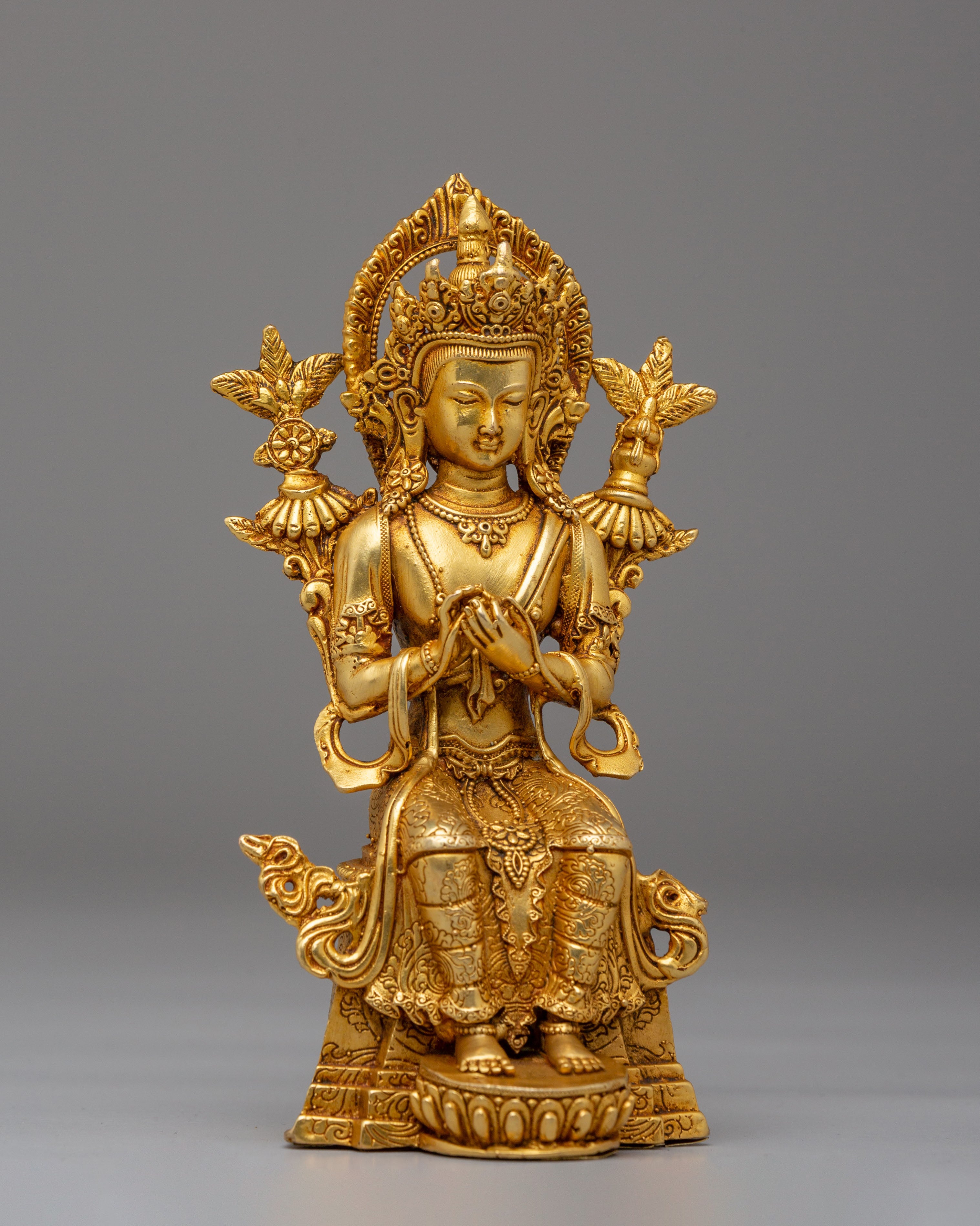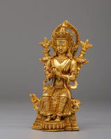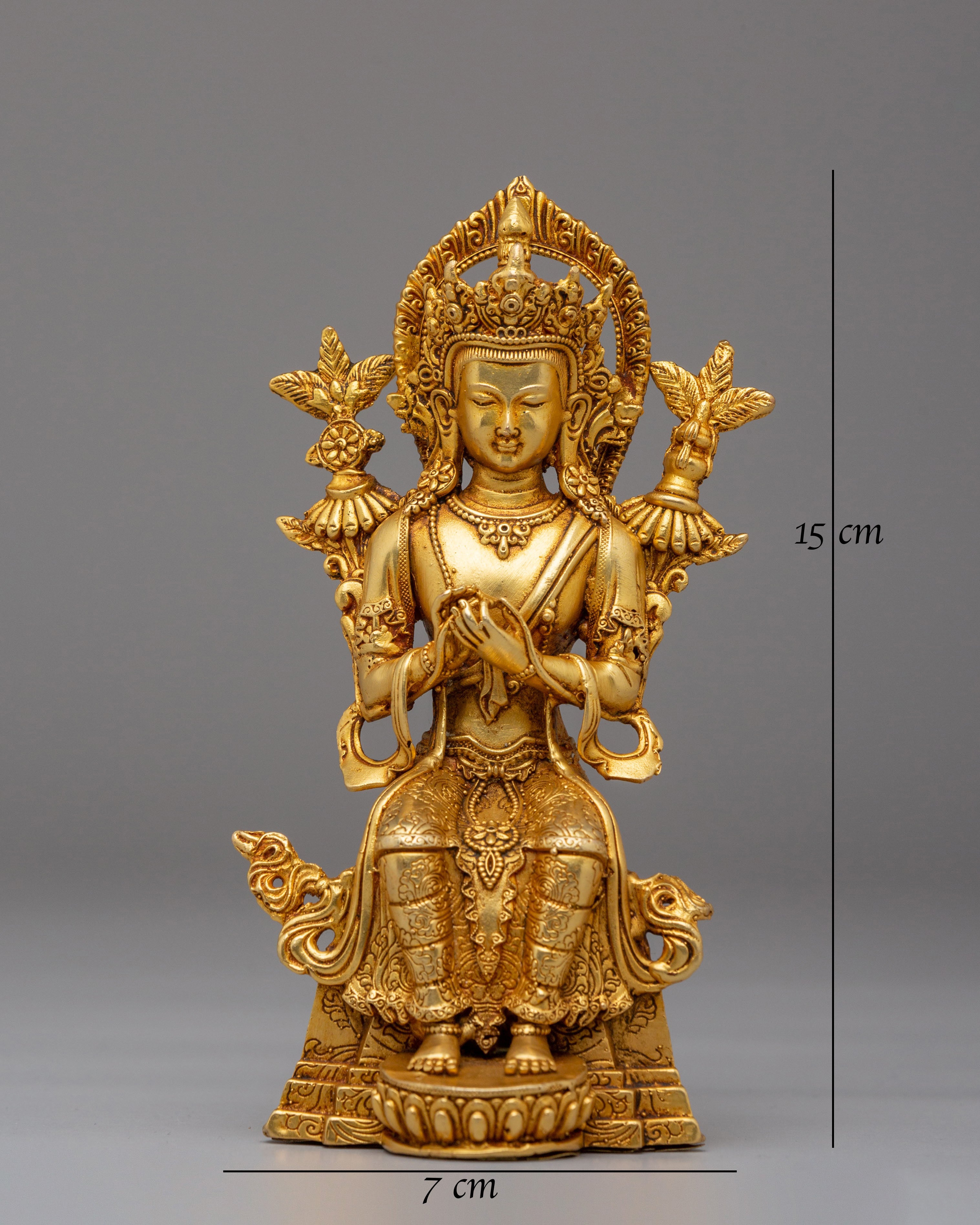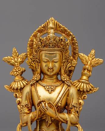 Maitreya Buddha is revered as the future Buddha in many Mahayana Buddhist traditions. Believed to appear on Earth to alleviate suffering and disseminate Buddhist teachings, he is often depicted seated on a lotus base with a serene expression. Sometimes shown holding a vase, which symbolizes his role as a teacher and dispenser of Buddhist knowledge, Maitreya embodies compassion and wisdom. He serves as a source of inspiration for practitioners, reminding them of the potential for enlightenment and the promise of a better future.