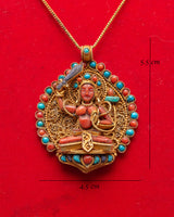 The Manjushri Ghau box pendant depicts Manjushri in his traditional form, wielding the sword of knowledge and the sutra (scripture), both of which represent the power of wisdom to cut through ignorance. The gold-plated silver body adds a polished touch, while the delicate designs on the Ghau box signify the sacred preservation of heavenly teachings. The use of coral and turquoise stones adds to the pendant's meaning—coral represents vitality and emotional protection, while turquoise is associated with healing and spiritual clarity.