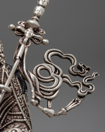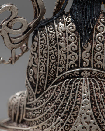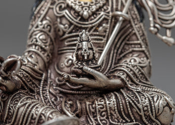 We have exclusively sculpted the mini copper body statue of Guru Rinpoche by machine, and the face of the deity is hand-carved and gilded with genuine 24k gold. This statue is small and can be utilized in Buddhist rituals and even as an indoor showpiece. We have depicted a deity sitting atop a lotus seat with a semi-wrathful expression carrying a vajra in his right hand while a vase in his left hand. The materials used in this sculpture are of high quality and will last for many years.