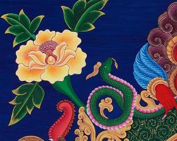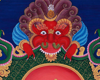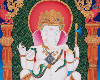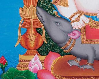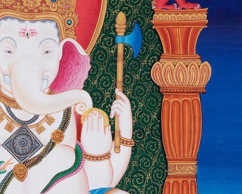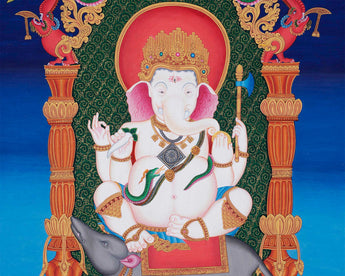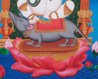 This is a Newari-style thangka of Ganesh who is one of the most popular guardian deities worshipped by Hindus and Buddhists alike. Ganesh is said to be the eliminator of obstacles and is worshipped daily by all. Ganesh, the elephant-headed god of wisdom and success is the defender and remover of obstacles and has to be propitiated first before worshipping any other gods. Being one of the sons of Shiva he bestows success in any form of work. His elephant head has only one full tusk and the other was broken during a battle with the demons. He rides on a mouse which is also his vehicle for transportation. In his right hand, he carries a mala or a set of beads in a string of thread and a laddu i.e. sweet ball.