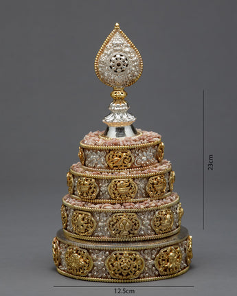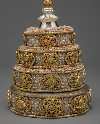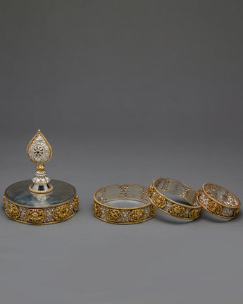 Our Ornate Mandala set is made of full silver and plated with pure gold. This particular set comes without the stand and the circular rings have beautiful hand carvings of Buddhist symbols of prosperity and auspiciousness. This gold-plated Mandala will be valuable to your Buddhist altar offering.