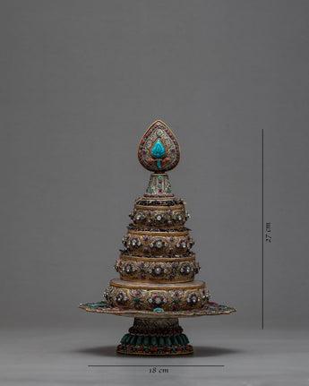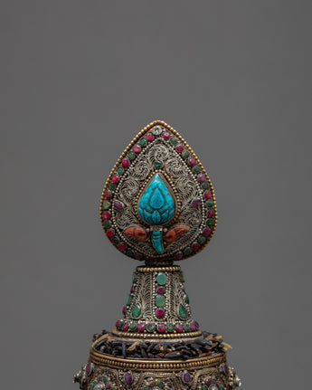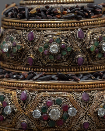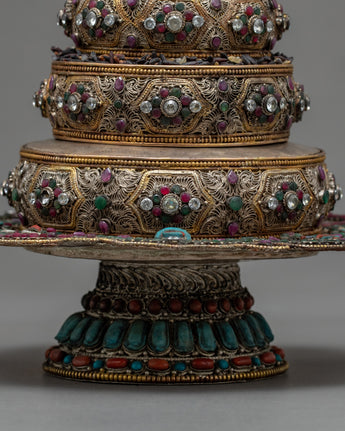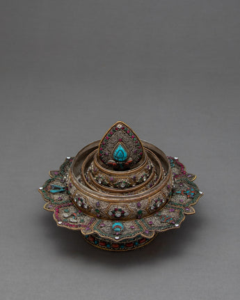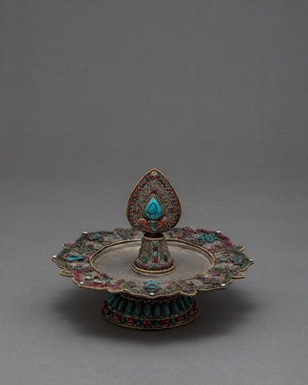 This is a well-crafted RATNA MANDALA which is made up of silver and completely handmade. This exquisite filigree work Mandala has a stemmed base design with precious Jerkin, emerald, ruby , coral, Lapis and turquoise stone settings. The same stone variations are used to decorate the plate and the entire mandala. All the stones used are of original quality and look beautiful and attractive. Made by skilled craftsmen from Patan, Nepal, this mandala is an exquisite mandala that you can offer.