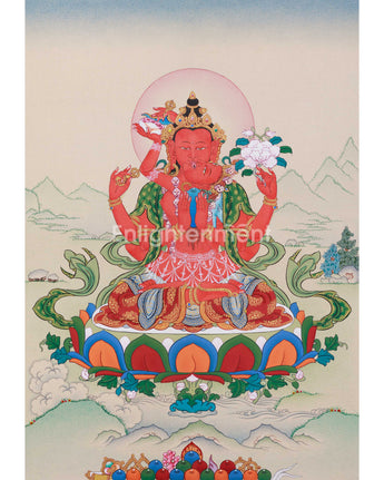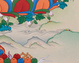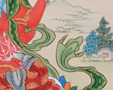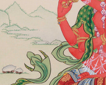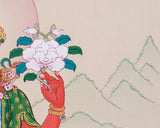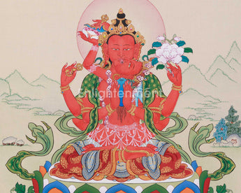 The Red Chenrezig with Consort thangka beautifully represents love, compassion, and wisdom. Hand-painted on fine cotton using natural stone colors and 24K gold, it showcases the divine elegance and depth of Tibetan spiritual art. The Karma Gadri style, celebrated for its gentle, flowing landscapes and elegant composition, gives the painting an ethereal feel. Every brushstroke demonstrates care and precision, while the natural colors add an earthy energy that deepens its spiritual significance. This thangka emanates sacred energy, making it ideal for meditation, healing, or serving as a striking focal point in a spiritual setting.