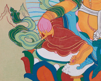 The 12-inch Dzambhala Thangka is hand-painted on high-quality cotton canvas using vibrant acrylics and adorned with genuine 24K gold accents. Made in the traditional Karma Gadri style, this thangka features detailed artwork, bright colors, and gold highlights typical of Tibetan Buddhist art. The Karma Gadri method adds spiritual depth, making it a meaningful item for meditation and reflection. Every brushstroke and gold showcases the devotion and meticulous craftsmanship behind it, rendering it not only visually striking but also a sacred symbol of Dzambhala's energy.