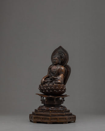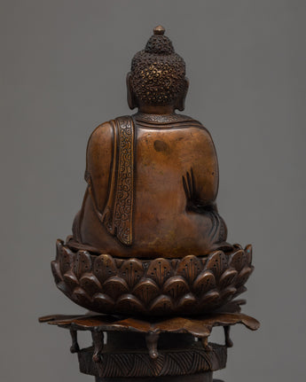 Buddha Shakyamuni statue, seated in vajra posture on a lotus seat with a calm and peaceful face. Shakyamuni Buddha is also known as Gautam Buddha.