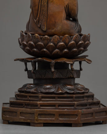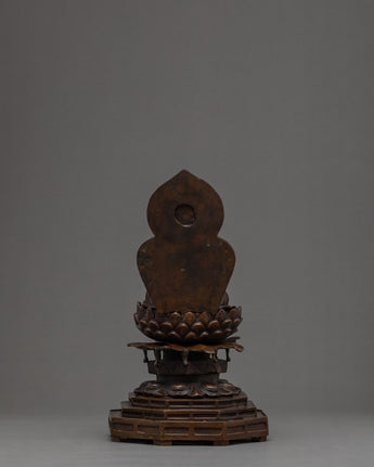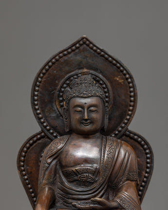 This Buddha Shakyamuni statue has an oxidized copper body and has been finished with acrylic paints. The deity is sitting on a lotus throne, wrapped in regal robes, with flawless detailing emphasising every part of the statue. This exquisite sculpture will make an excellent gift for meditation or yoga activities for a practitioner such as yourself.