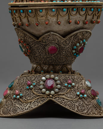The antique kapala skull bowl is a complete siku-designed bowl. Siku is a process of putting patterns in the product by wielding copper, silver, or other metals, and creating various types of patterns and designs. This kind of artistry is really expertly done.