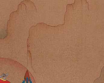 Guru Padmasambhava, known as the Lotus-Born Master, is a central figure in Tibetan Buddhism. He is recognized for bringing Buddhism to Tibet and overcoming local spirits to establish the Dharma's growth. Born from a lotus in Oddiyana, he's associated with tantric practices and regarded as a second Buddha. Revered for transforming obstacles into growth opportunities, he helped establish Tibetan Buddhism. In this thangka, Padmasambhava sits on a radiant lotus throne, symbolizing purity. He holds a vajra for wisdom and a skull cup with nectar for tantric power. Gold accents add a sense of divinity, while the scenery reflects his mystical energy. The lotus emphasizes his purity and enlightened connection, capturing his profound presence and blessings.