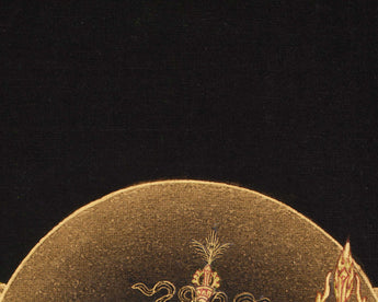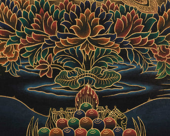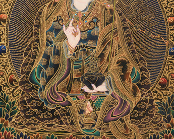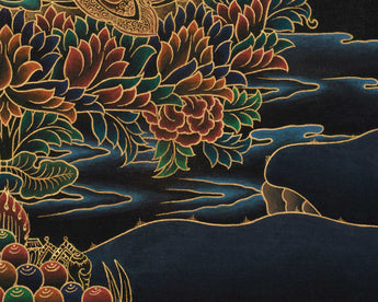 The lotus-born guru rinpoche thangka is a work of art created from the finest materials, blending exceptional craftsmanship with a deep spiritual heritage. Every detail comes alive through hand-painted artistry on cotton canvas with acrylic colors. The use of 24K gold in the traditional Nakthang style—a technique involving carefully placing gold on a black canvas to create a striking, ethereal contrast—makes this thangka unique. The exquisite combination of cotton canvas, acrylics, and gold ensures that this thangka remains a sacred object full of beauty and significance, rather than just a piece of art.