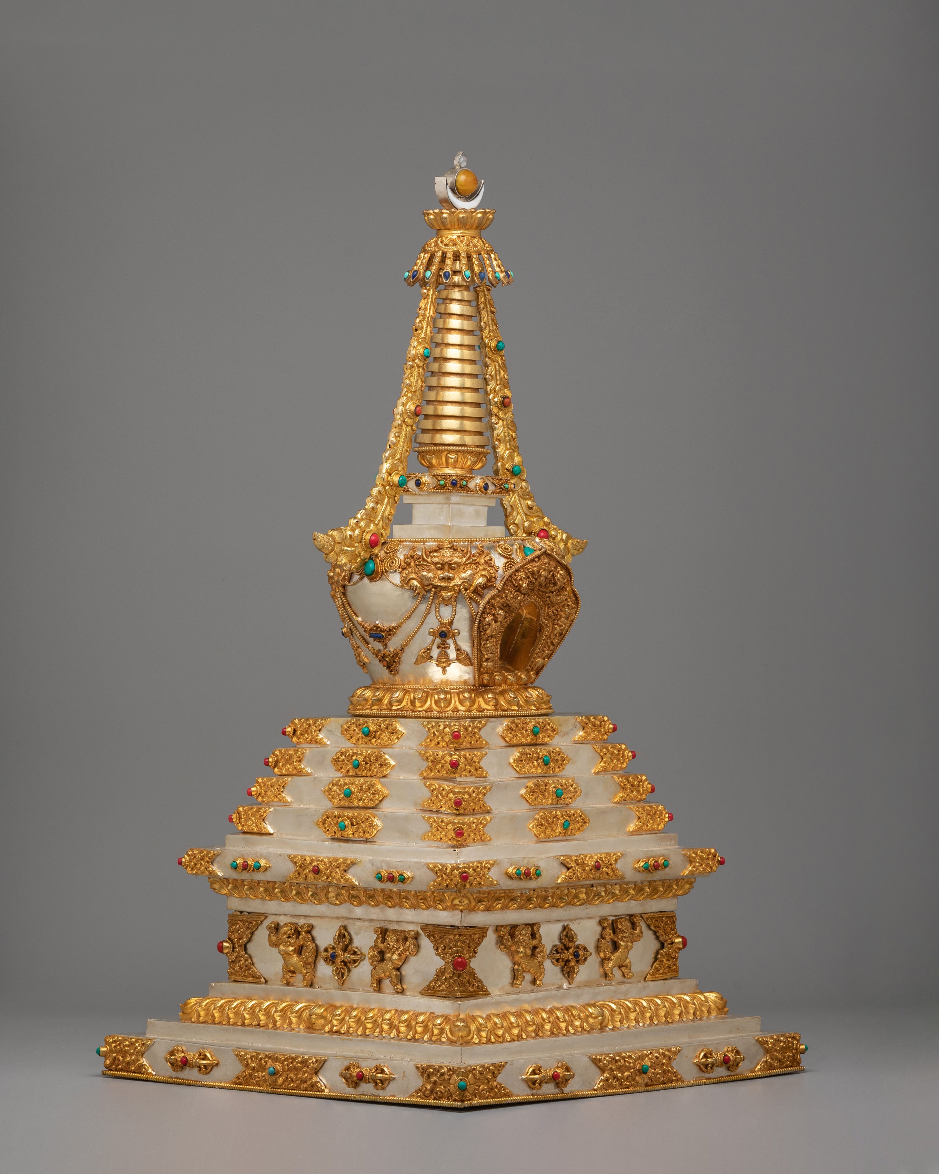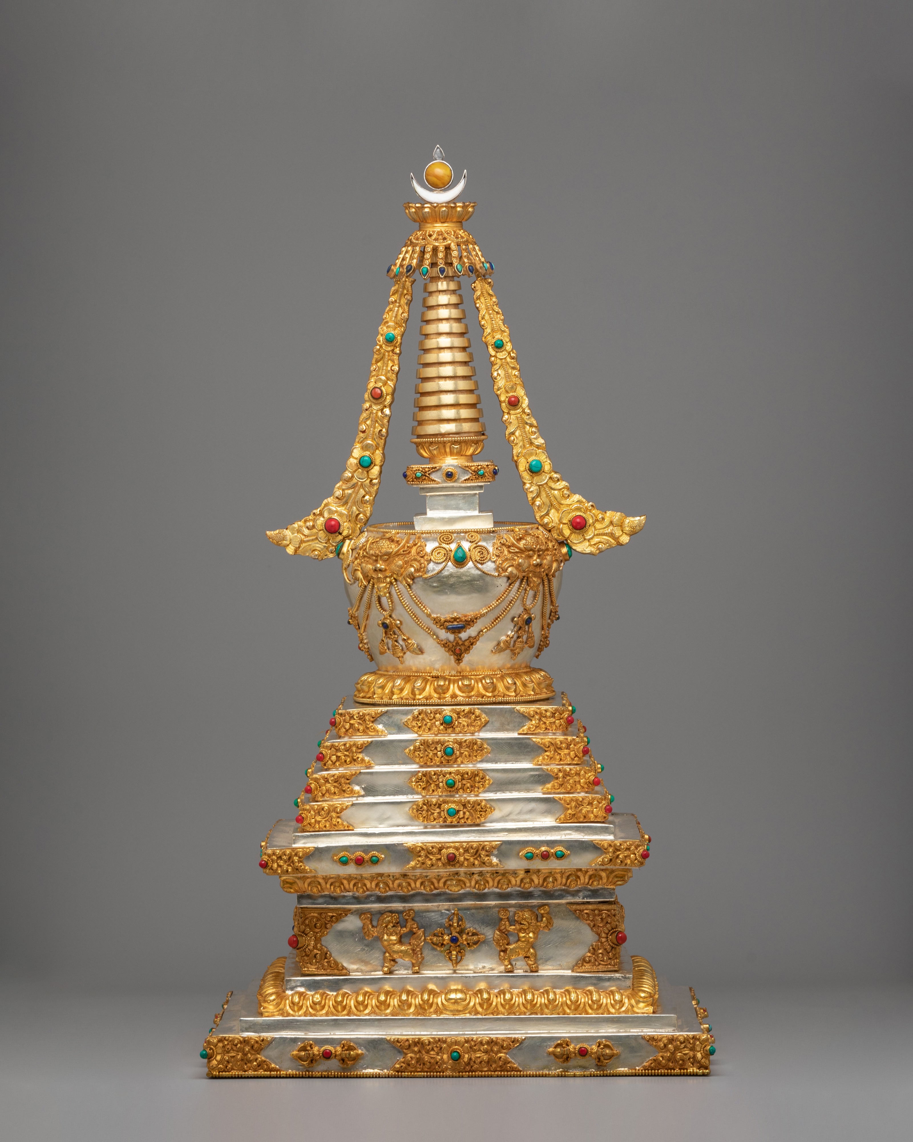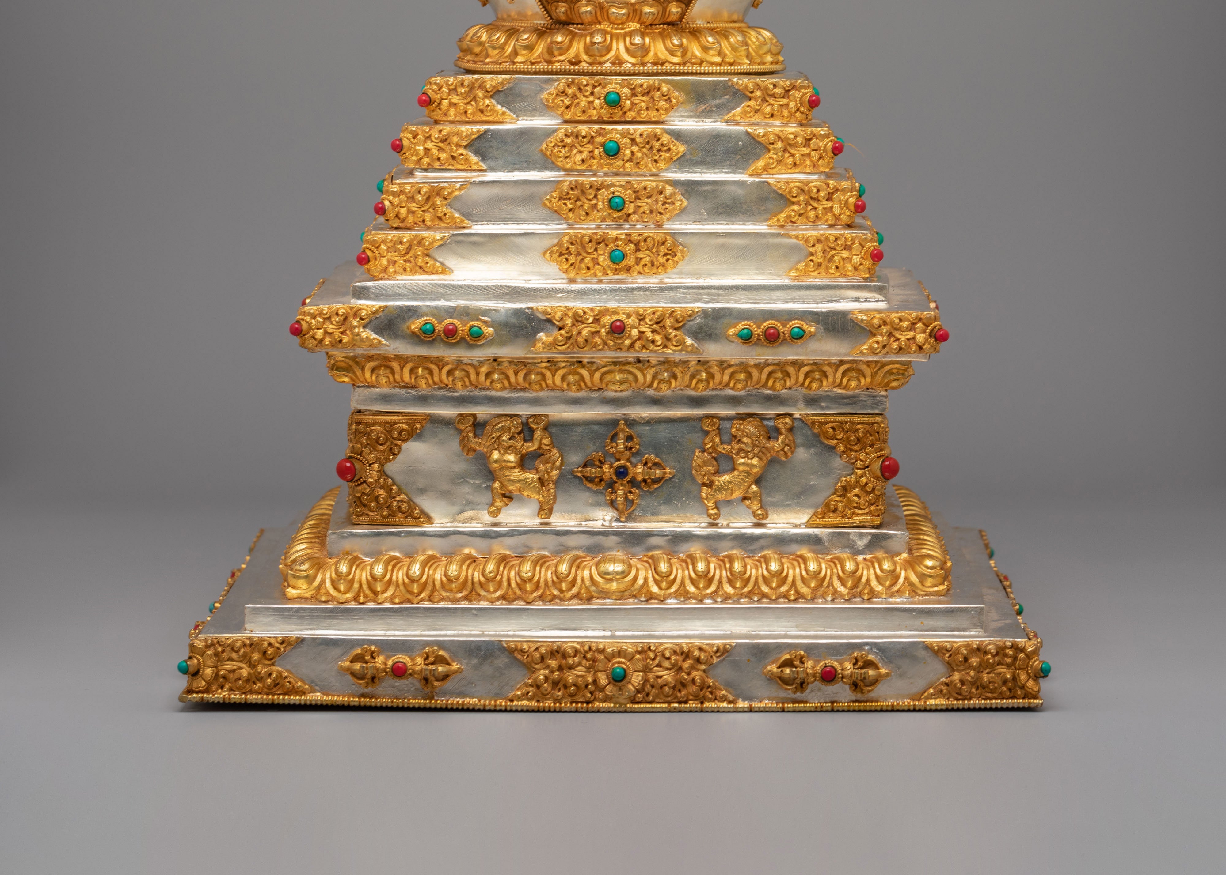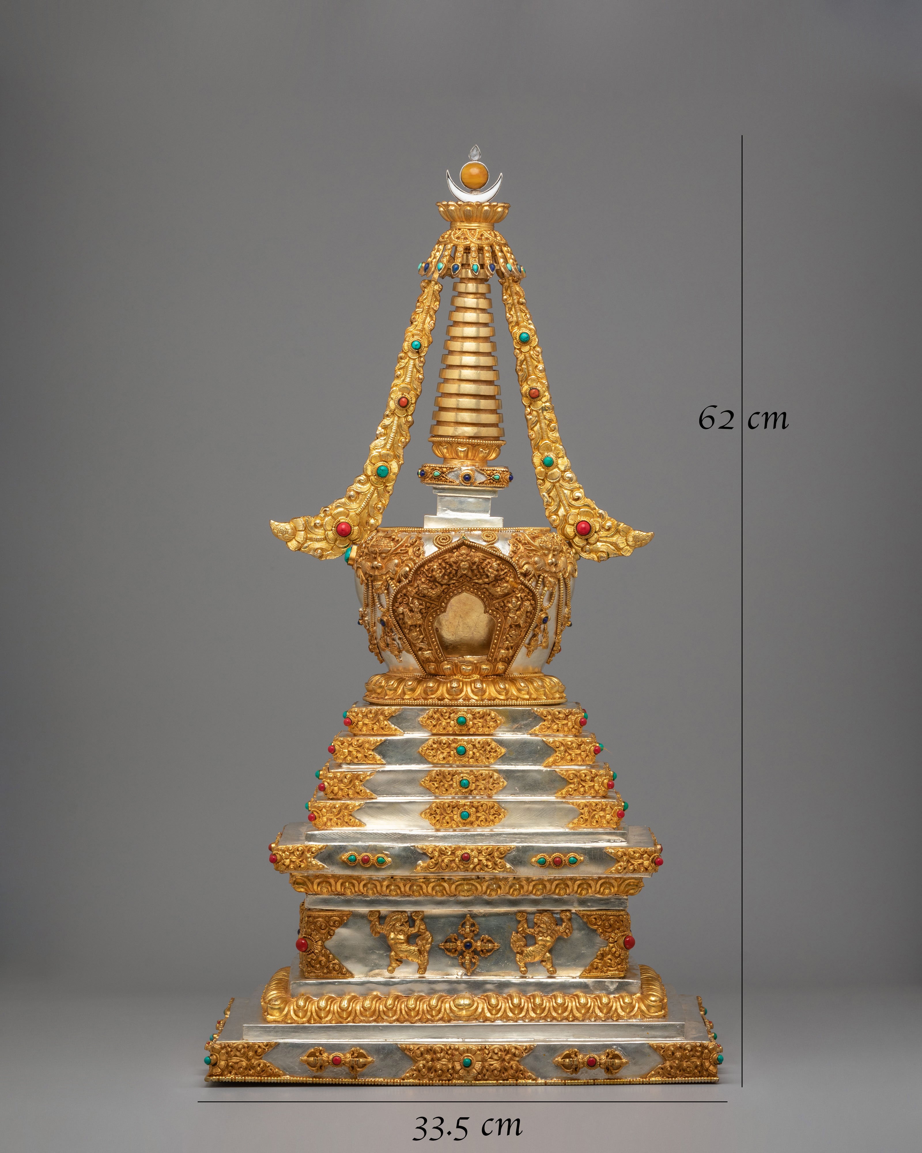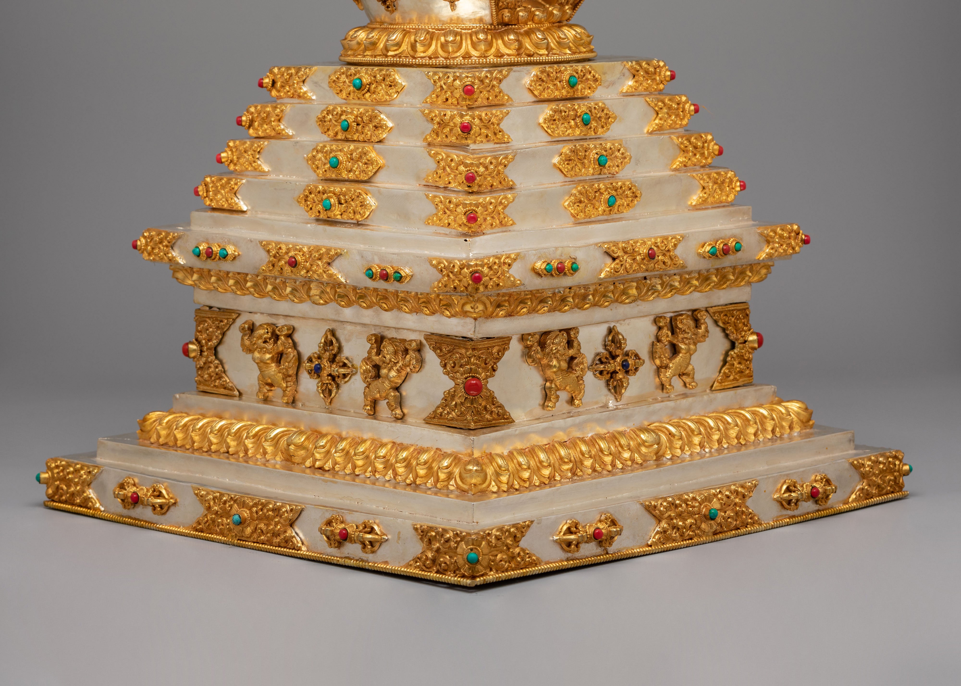 This sacred stupa is meticulously handcrafted using 97 percent pure silver formed over a copper core, containing approximately 3159 grams of high purity silver, and enriched with elegant gold plating that gives it a luminous ceremonial finish. The precious metal combination reflects the artistic traditions of Himalayan metalwork, where sacred objects are created with offerings of valuable materials as a sign of devotion and respect. Hand set gemstones add vibrant accents that enhance its spiritual beauty while reflecting traditional decorative styles seen in Tibetan monasteries. The refined detailing, polished surfaces, and careful ornamentation highlight the skill of master artisans and give the piece a luxurious presence admired by collectors of Tibetan Buddhist statues and Himalayan ritual art.