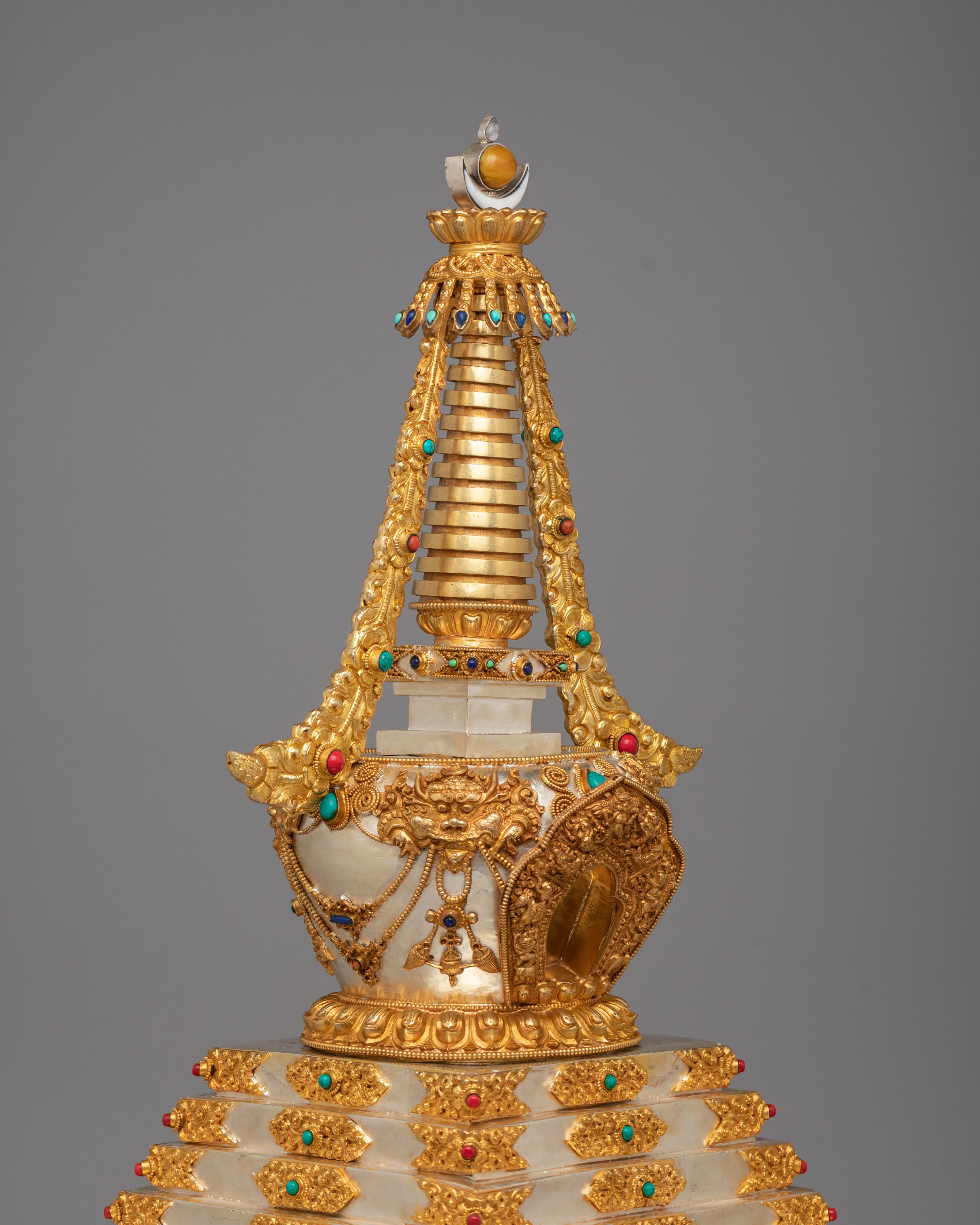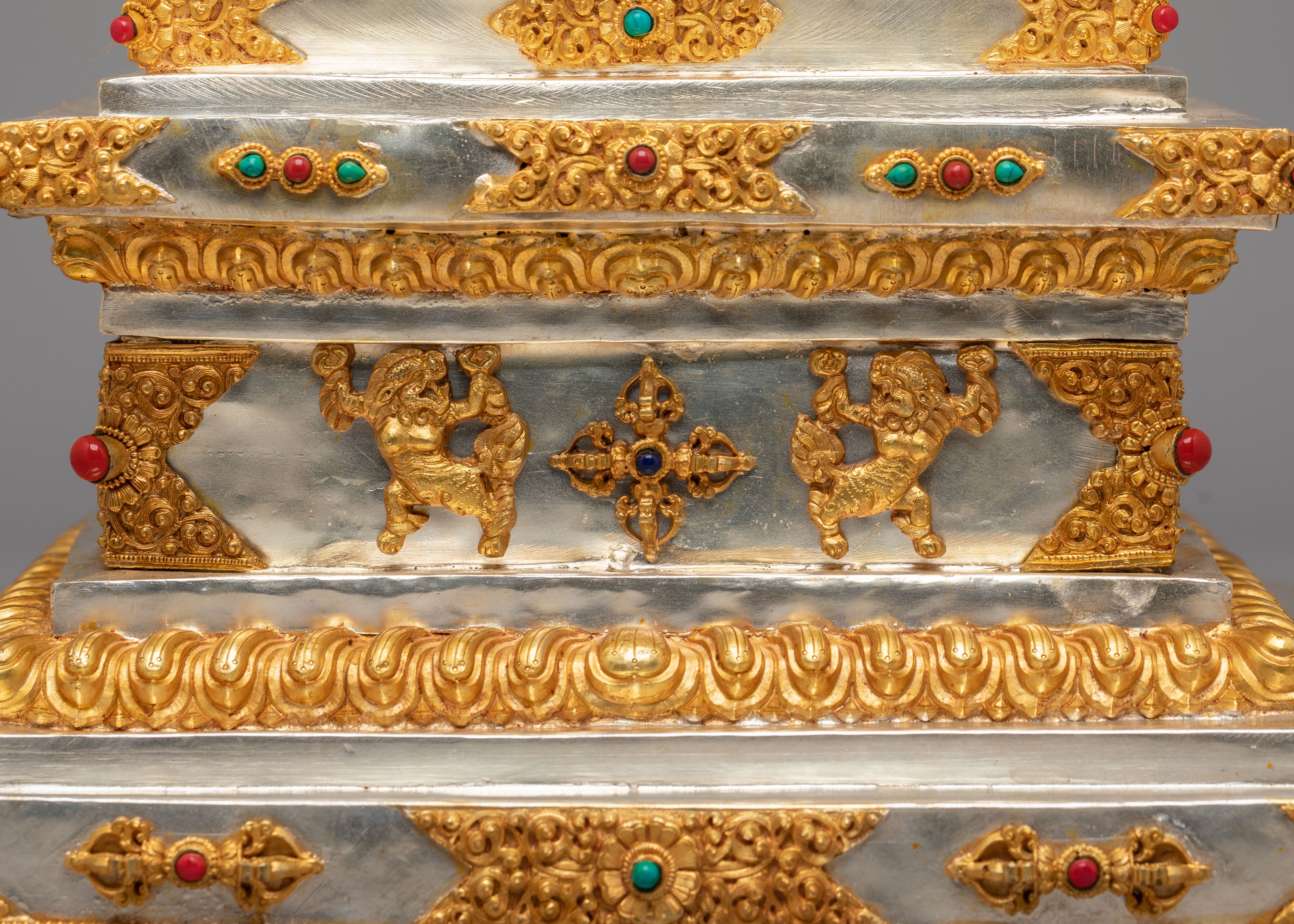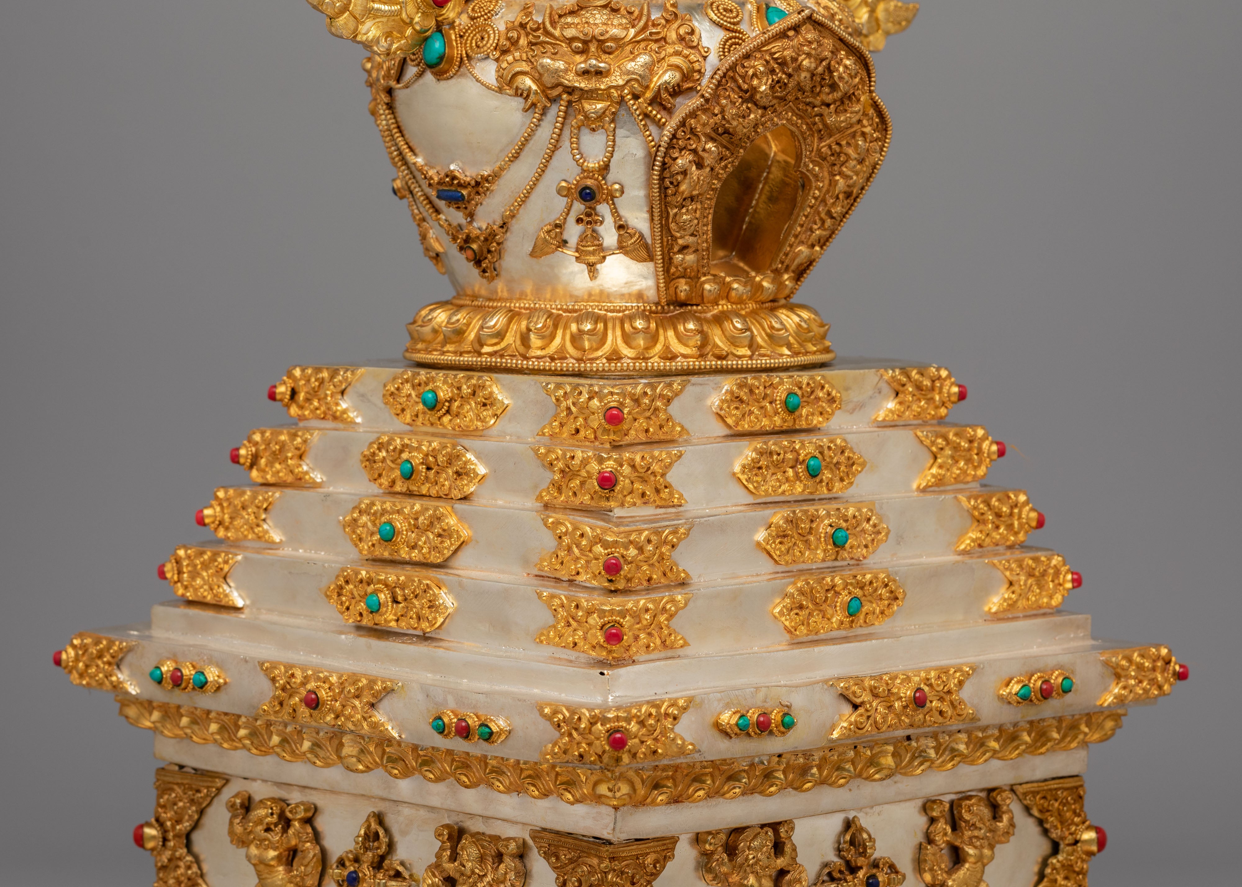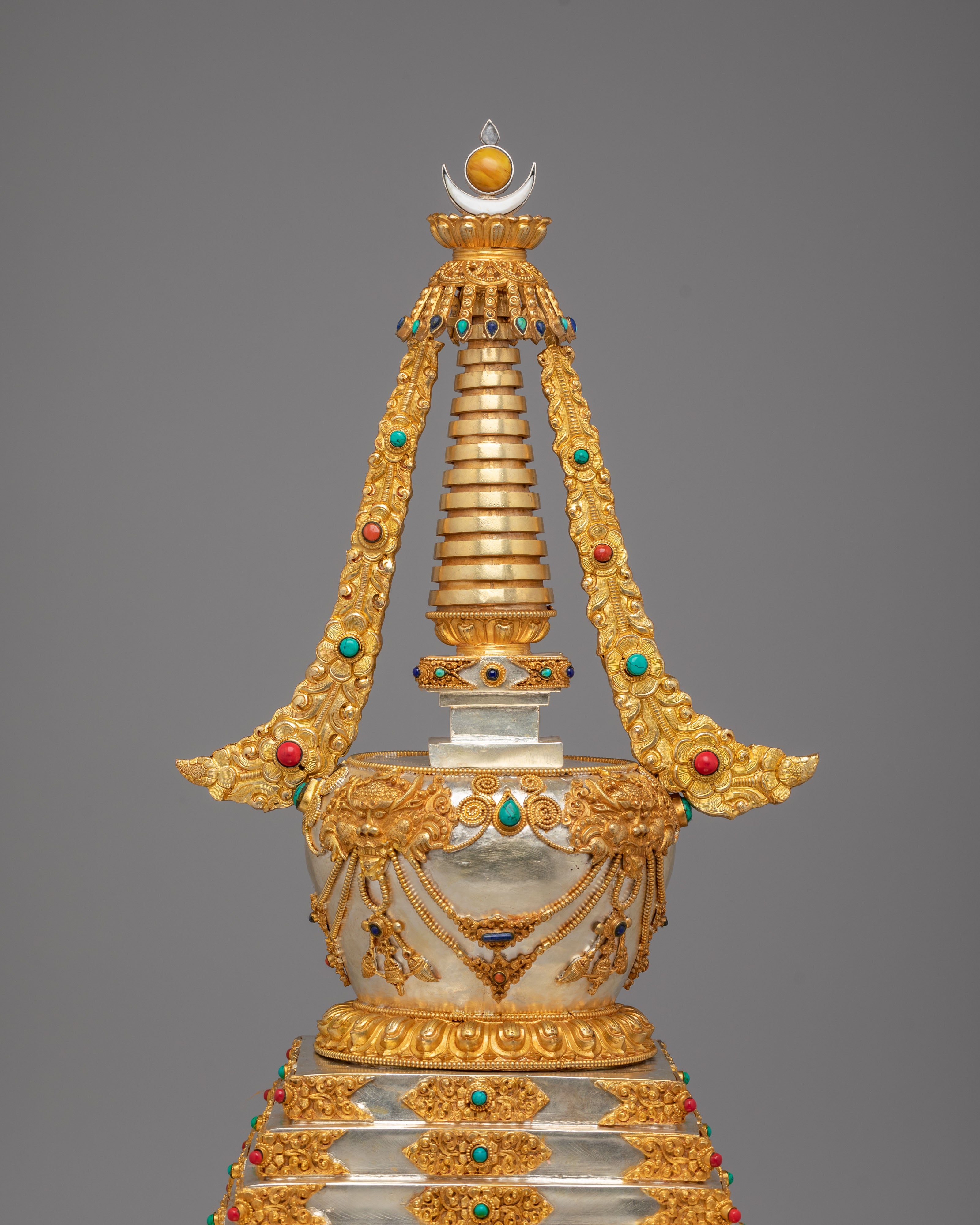 This sacred stupa is meticulously handcrafted using 97 percent pure silver formed over a copper core, containing approximately 3159 grams of high purity silver, and enriched with elegant gold plating that gives it a luminous ceremonial finish. The precious metal combination reflects the artistic traditions of Himalayan metalwork, where sacred objects are created with offerings of valuable materials as a sign of devotion and respect. Hand set gemstones add vibrant accents that enhance its spiritual beauty while reflecting traditional decorative styles seen in Tibetan monasteries. The refined detailing, polished surfaces, and careful ornamentation highlight the skill of master artisans and give the piece a luxurious presence admired by collectors of Tibetan Buddhist statues and Himalayan ritual art.