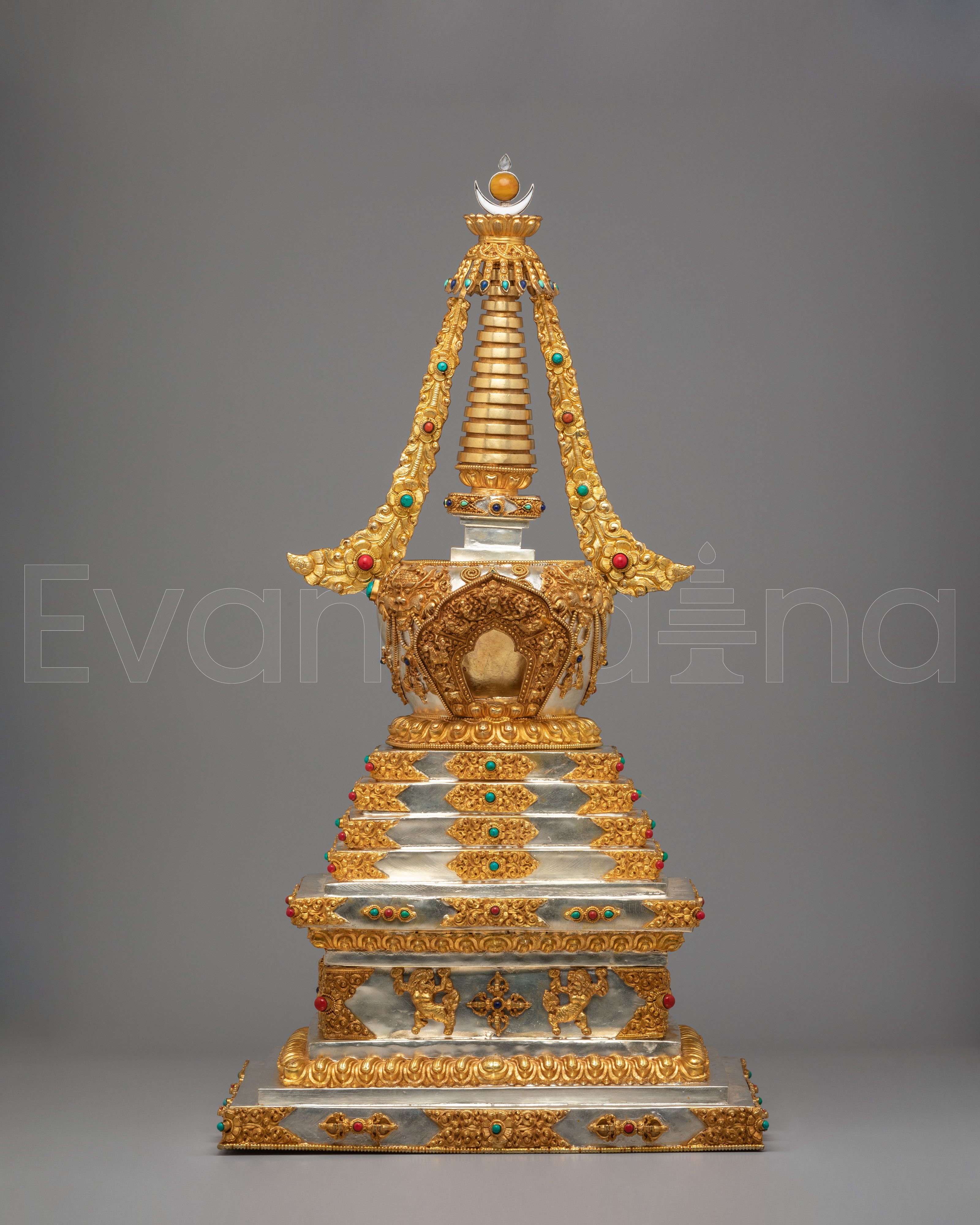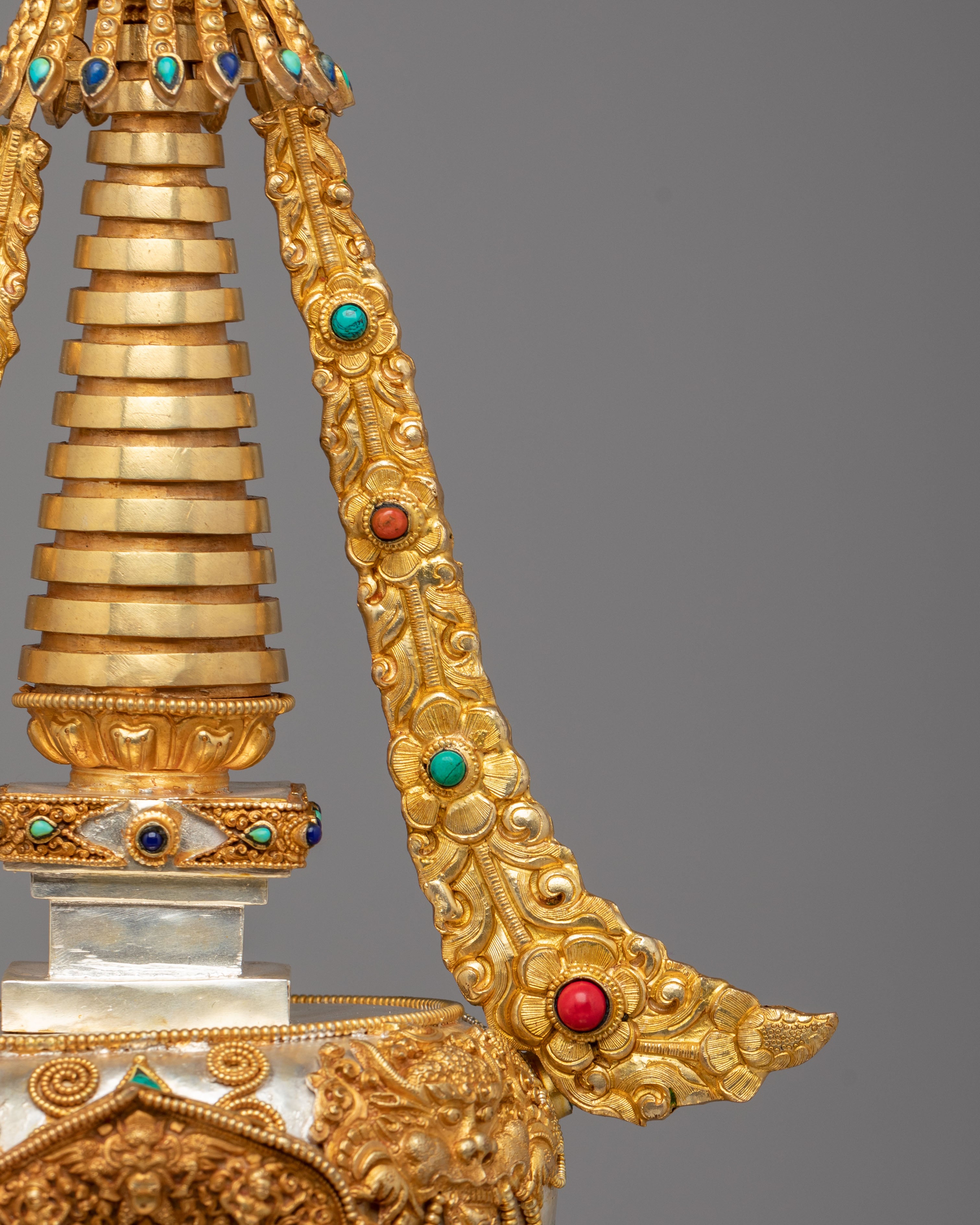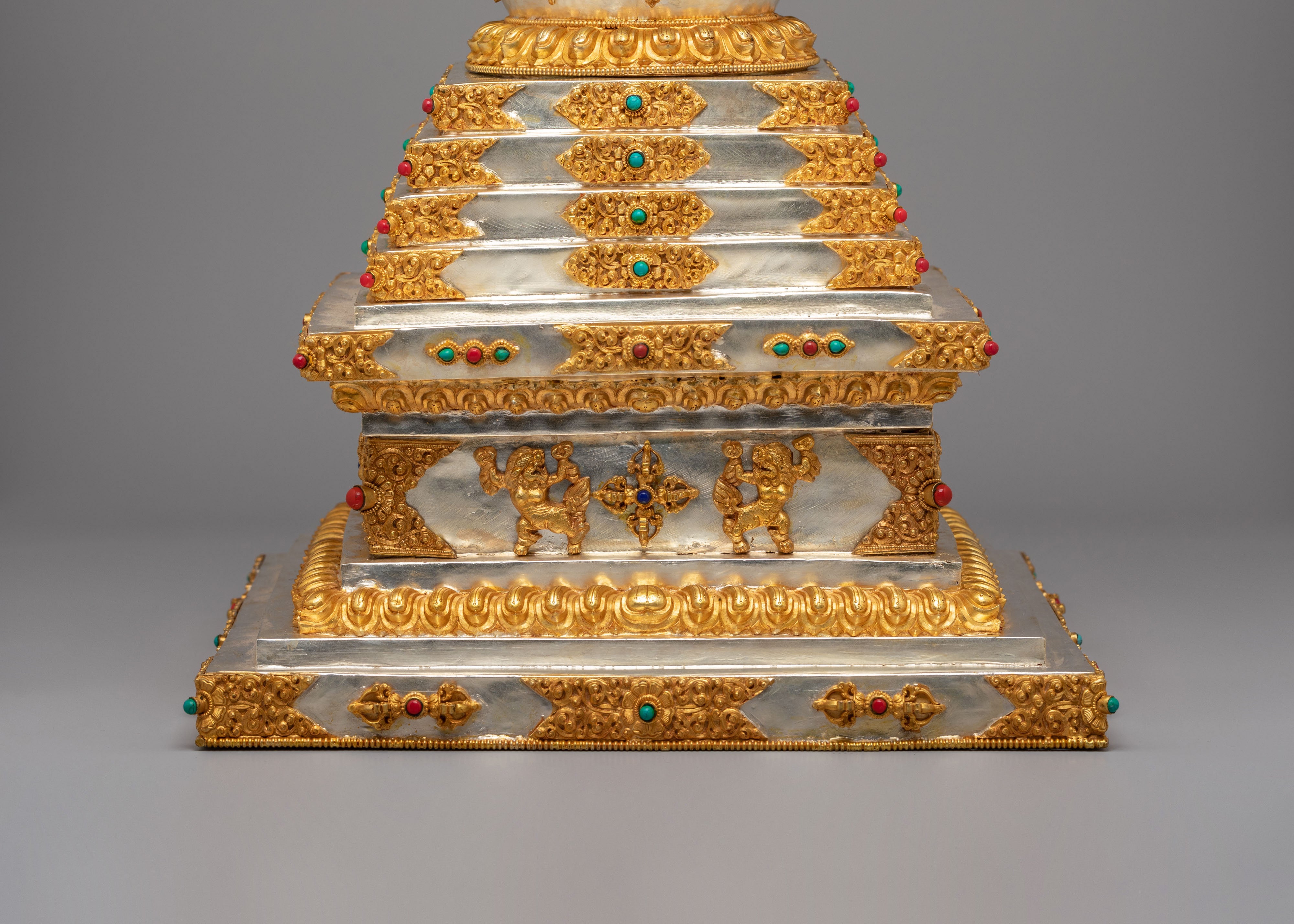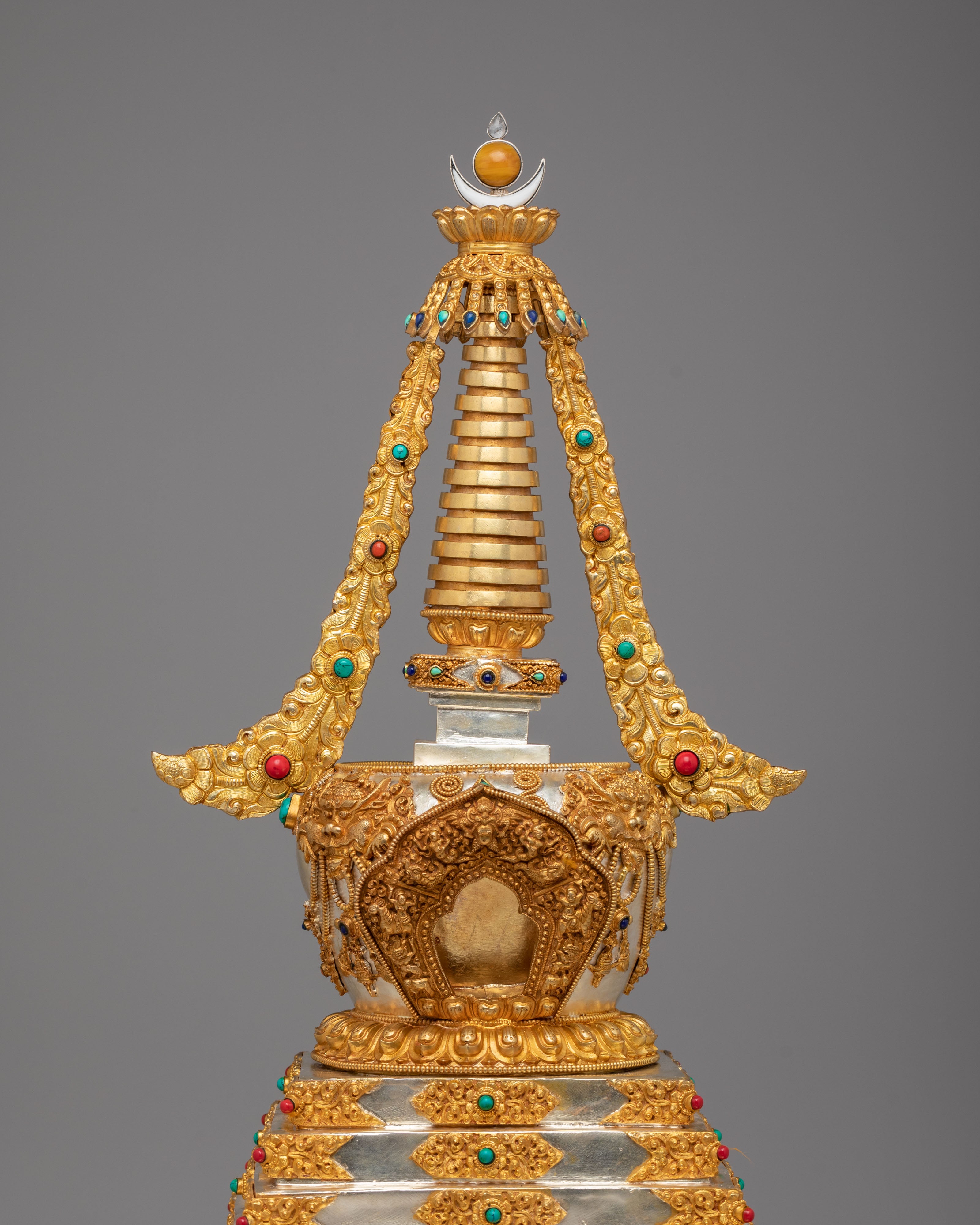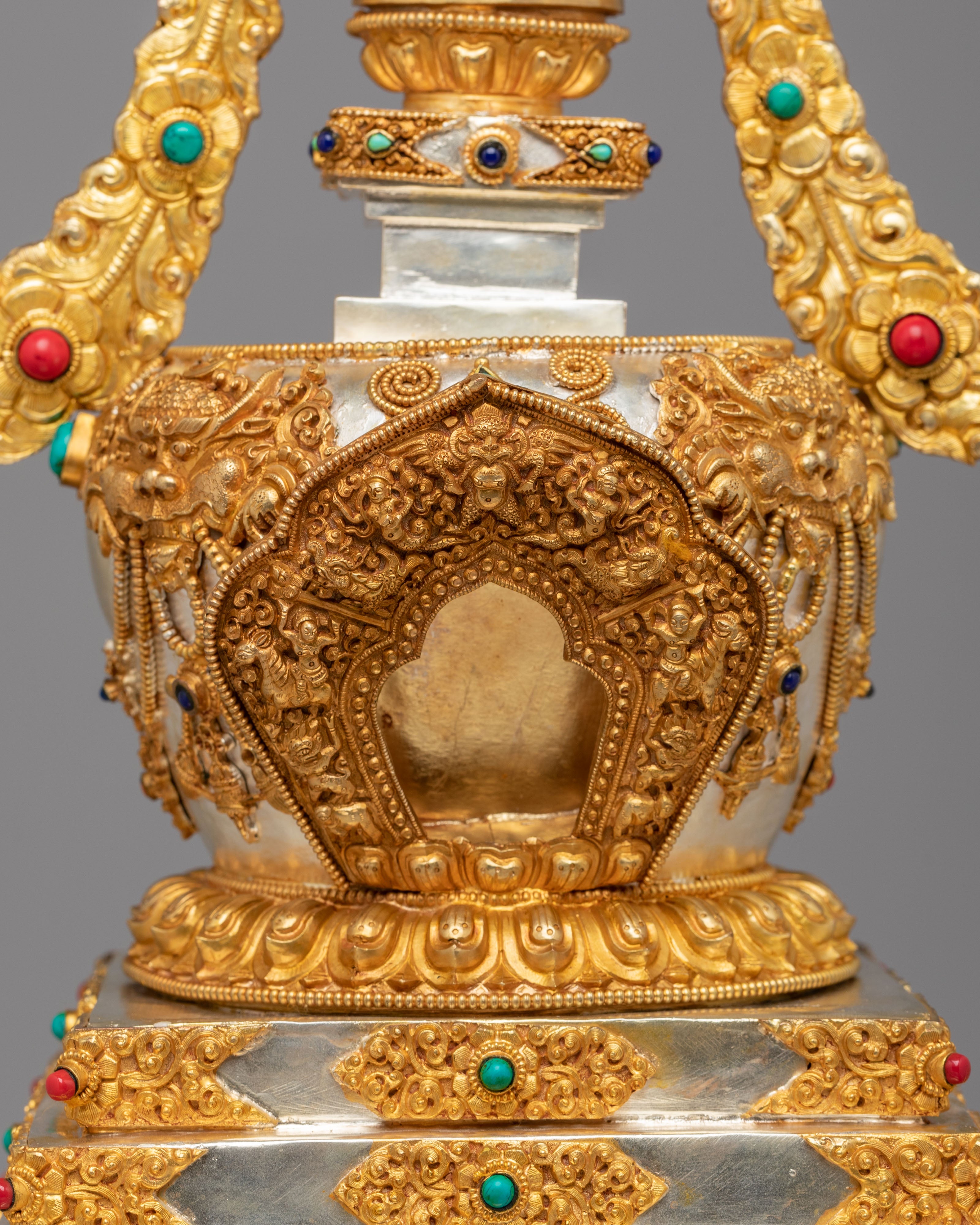 This sacred stupa is meticulously handcrafted using 97 percent pure silver formed over a copper core, containing approximately 3159 grams of high purity silver, and enriched with elegant gold plating that gives it a luminous ceremonial finish. The precious metal combination reflects the artistic traditions of Himalayan metalwork, where sacred objects are created with offerings of valuable materials as a sign of devotion and respect. Hand set gemstones add vibrant accents that enhance its spiritual beauty while reflecting traditional decorative styles seen in Tibetan monasteries. The refined detailing, polished surfaces, and careful ornamentation highlight the skill of master artisans and give the piece a luxurious presence admired by collectors of Tibetan Buddhist statues and Himalayan ritual art.