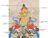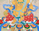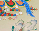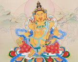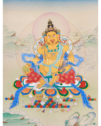 This thangka depicts him as an influential, majestic figure seated on a lotus throne, symbolizing purity and divine authority. He wears an ornate five-jeweled crown and a garland of utpala flowers, indicating his status as a wealthy deity. Also known as Dzambhala, he is associated with safeguarding and enhancing wealth, as well as alleviating financial hardships. In his right hand, he holds a citron fruit in the granting mudra, representing the fulfillment of wishes related to wealth and abundance. His left hand cradles a mongoose spitting jewels, symbolizing the continuous flow of prosperity. The conch shell and vase at his feet signify ongoing blessings and financial wealth.