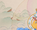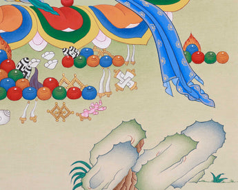 Immerse yourself in the sacred abundance of Jambhala Painting, a breathtaking piece of art carefully hand-painted on fine cotton canvas using natural stone colors and 24K gold accents. Jambhala, also known as Dzambhala, is associated with protecting and increasing wealth, as well as alleviating poverty and financial difficulties. The Thangka is painted in the Karma Gadri style, characterized by elegant lines, a broad composition, and a balanced harmony between the divine figure and the surrounding landscape. This minimalist approach enables viewers to concentrate on the deity's aura while enjoying the tranquil setting.