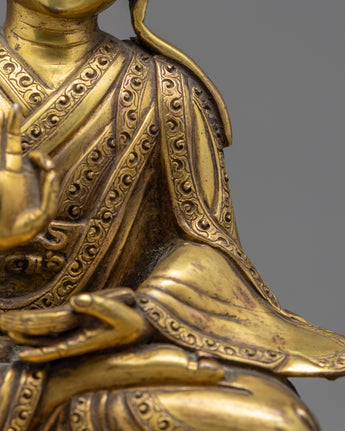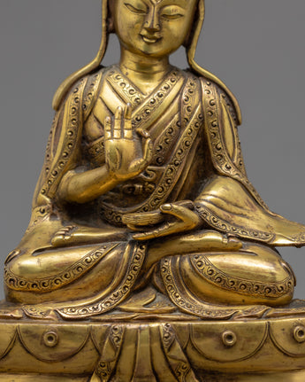 This gold-plated Gedun Druppa statue is hand-carved in copper and features a peaceful look on the face. The statue is finished with acrylic paint.