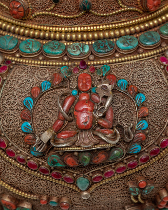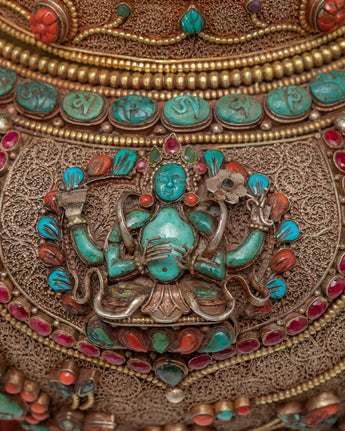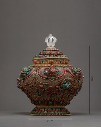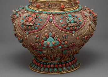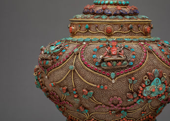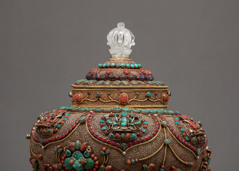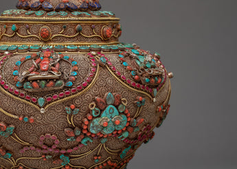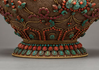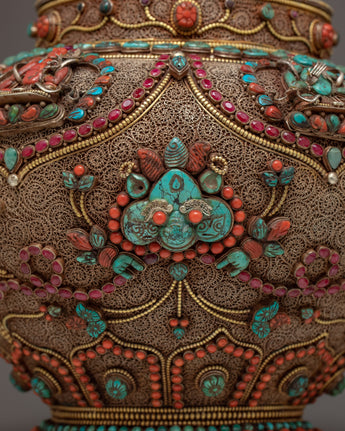 The traditional rice offering bowl is also known as gulpa is entirely a hand-carved item. The rice offering bowl is finely designed with seku making it more attractive and antique. The top lid holds a half vajra and the entire bowl is decorated with Coral, Turquoise, Lapis, and Crystal Stones to yield a rich and sensuous finish.