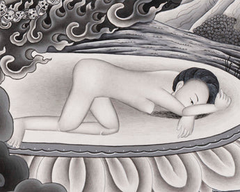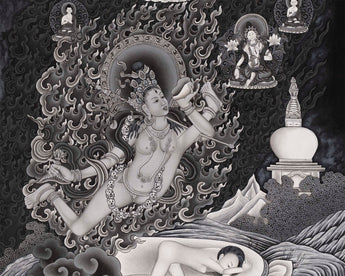 The deity potrayed in the thangka is Vajrayogini who is also locally known as Aakash yogini or Bijeshwari. Her temple is situated in Kathmandu on the banks of Bagmati river below Swayambhu stupa hill. This form of Vajrayogini practice is from the the tradition of Adwayavara / Maitripa. Maitripa was one among the 84 Great Mahasiddhas. He was from Lumbini, Nepal and had also taught in the Great Buddhist institution - Nalanda.