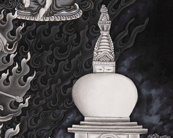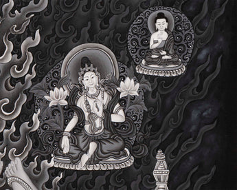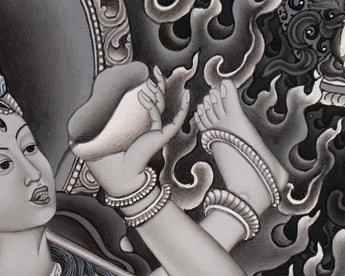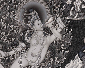We have painted this Aaksh Yogini Thangka in the traditional Tibetan style, following all the correct attributes of the Tantric Buddhist. Our thangka is beautifully painted with natrual stone color.
