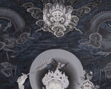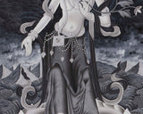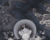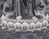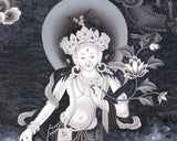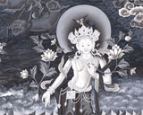 On the Right side of this monochromatic painting, we see Green Tara, a female Buddhist deity linked to enlightened activity and abundance. She is widely regarded as a compassionate and action-oriented Bodhisattva. She is swift to take action, whenever someone asks for help. Therefore, She is an inexhaustible source of compassion.revered as a protector who comes to alleviate physical, mental, and spiritual suffering.