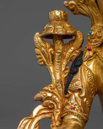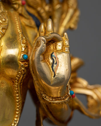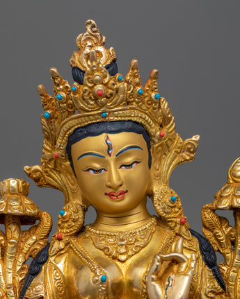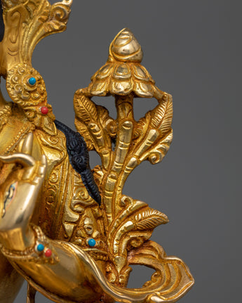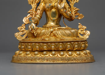 The seven eyes on White Tara's face, hands, and soles make her so revered; they signify her omniscient knowledge of the world's suffering and her unwavering commitment to healing it. The sculpture's 24K gold gilding reflects White Tara's role as a beacon of purity and spiritual integrity, guiding practitioners to healing and enlightenment.