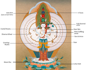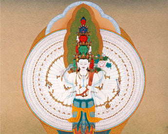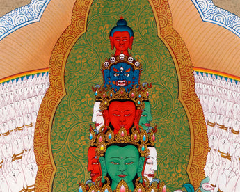 In a serene background, Avalokiteshvara, Compassion Buddha, is shown in the 1000 Arm Chenrezig Thangka. He is seen wearing priceless jewelry as well as colorfully patterned silk. His left hands carry a lotus, bow, and arrow, Empowerenment vase, while his right hands hold a crystal rosary, Dharmachakra, respectively, out of 1000 arms. He has eleven different personalities. His center face is white, right green, and left red, out of the three on his shoulders. His center face is white, right green, and left red. His green face is in the center atop his white face, red on the right and white on the left.