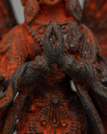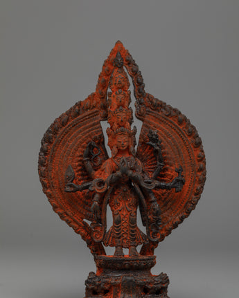 This statue is a profound spiritual symbol and a lovely decorative item. Buddhists believe that Chenrezig's multiple arms represent his ability to reach out and assist all sentient creatures in need. Having this statue in your house or meditation area can be a potent reminder to practice empathy and compassion, encouraging you to do the same in your life. Each piece is guaranteed to be unique due to its handcrafted nature, which makes it an excellent addition to any collection or spiritual practice.