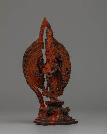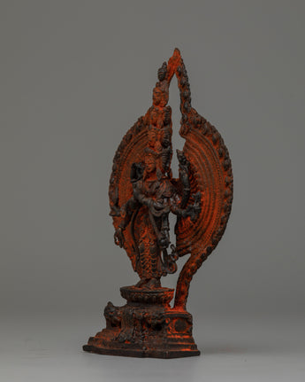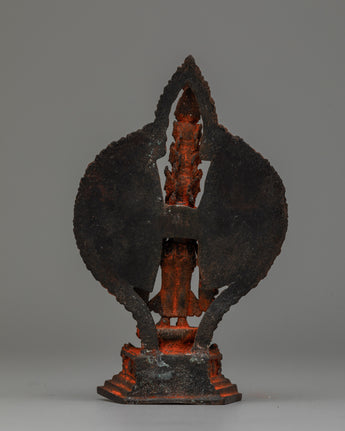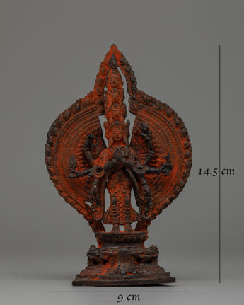 Standing at a height of 14.5 cm, the 1000 Arm Chenrezig Statue is an incredible piece of handcrafted, precisely created copper sculpture. Renowned Buddhist deity Chenrezig, sometimes called Avalokiteshvara, represents kindness and compassion. This intricately handmade statue has a thousand arms, each symbolizing the deity's infinite compassion and capacity to help innumerable beings. The copper accentuates the statue's rich, warm tone and highlights Chenrezig's calm look and other minute details.