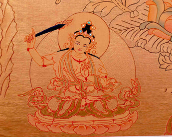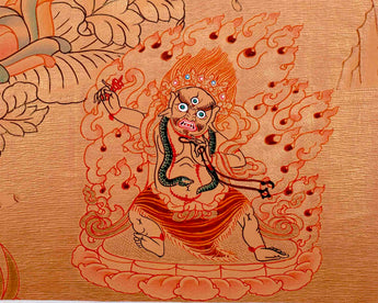 Experience the wonder of a Hand-Painted Thangka, a captivating work of art that blends exquisite craftsmanship with spiritual symbolism. This traditional Tibetan art form, painstakingly created by skilled artists, features intricate details and vibrant colors that capture the essence of Buddhist teachings and iconography. Each brushstroke tells a story, depicting deities, mandalas, and sacred symbols with utmost care and precision. The result is a masterpiece that delights the senses and inspires contemplation and spiritual growth. Whether you're a practitioner of Buddhism or simply an art enthusiast, owning a Hand-Painted Thangka is a meaningful and profound way to connect with a rich cultural heritage and bring a touch of serenity and beauty to your living space. Every Thangka is a unique creation, a testament to the artist's skill, patience, and dedication.