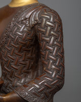 Handmade in a copper body, the face of the statue is painted with 24k gold powder, and Buddha's body is composed of copper alloy. He is pictured with a peaceful countenance, seated atop a lotus seat. His right hand is downward in the earth-touching motion (bhumisparsha mudra), with which he calls the earth goddess Sthavara to assert his claim to enlightenment, and he holds an alms bowl in his right hand.