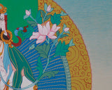 The thangka features White Tara seated in the vajra posture on a lotus seat and moon disc, symbolizing purity and spiritual awakening. She holds a pundarika (lotus flower) in her left hand, representing enlightenment, while her right hand gestures in a mudra of granting blessings. Her white body symbolizes purity and compassion, adorned with delicate jewelry and a five-jeweled crown that signifies her enlightened status. Her seven eyes consist of the two regular eyes on her face, a third eye on her forehead, two on the palms of her hands, and two more on the soles of her feet. These symbolize her all-seeing compassion, vigilance, and ability to perceive suffering everywhere, offering protection and healing to all beings.