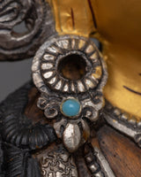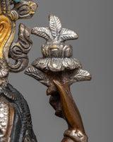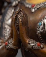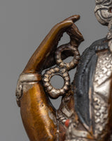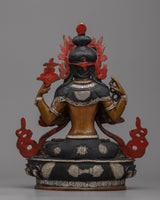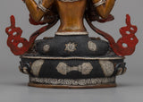 The statue, made of oxidized copper, has a depth of character that is heightened by the soothing shine of silver plating. This stunning contrast not only highlights the statue's precise craftsmanship but also reflects Chenrezig's purity and endless compassion.