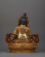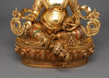 Wrathful Yellow Dzambhala is a wonderful statue measuring 15.9 inches tall with a base width of 14.4 inches and weighing 8.63 kg. This gorgeous item is precisely constructed from Copper Body, with stunning triple layer 24K Gold Gilding, Gold & Acrylic Paintings, deeply engraved carvings, and Hand Carved Gemstone, making it the perfect centerpiece for any spiritual collection.
