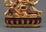 Presenting the colorful statue of Lord Ganesh, the well-known bringer of wealth, knowledge, and removal of obstacles: the 4-Arm Ganesh Statue. This statue, which stands at an enticing height of 11.8 inches on a base of 9.4 inches and weighs 3.94 kg, personifies the joyful and giving nature of Ganesh. With its oxidized copper body for a classic look and intricate gold and acrylic paintings enhancing the gilding, this work perfectly portrays the essence of Ganesh's dynamic presence and his significant significance in the Hindu faith.