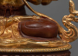This copper statue has layers of gold gilding, which gives it a brilliant, long-lasting polish and a tranquil, regal appearance. The figure of Chenrezig is given lively life with acrylic paintings and gold, which accentuate the fine features.