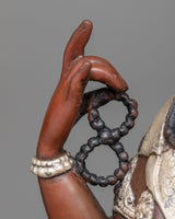 The statue is beautifully crafted from high-quality copper and has an oxidized body that provides depth and an antique look. The statue's elegance is enhanced by silver plating, which highlights the peaceful features and delicate details of Chenrezig's dress and symbolic qualities.
