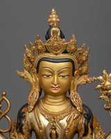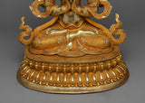 Our 4-Armed Chenrezig Buddha Statue is the embodiment of unbounded compassion. This exquisitely created piece, embellished with 24K Gold Gilding on a Copper Body, exudes calm empathy and spiritual depth. Gold and acrylic paintings create a dazzling, reflected aspect, highlighting the fine details and symbolizing Chenrezig's pure, radiant heart.