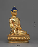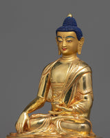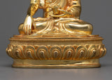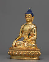 The Statue is depicted sitting atop a moon disc of a beautifully carved lotus seat with a calm and scenery look on his face. He is holding an alms bowl in his left hand, and with his right hand, he is on earth touching mudra. The Statue is made of a copper alloy and then gilded in genuine 24k gold.