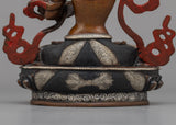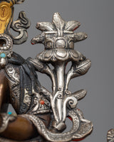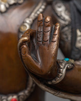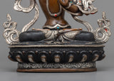 The statue's core is made of oxidized copper, giving it an ancient and robust appearance that is well complemented by the sparkling silver plating. This remarkable combination not only creates an eye-catching sculpture but also represents Manjushri's clarity and purity of insight. The reflected aspect of silver represents the mirror-like wisdom that Manjushri embodies.