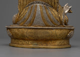 Handmade in Nepal by a group of Nepali artists, He is depicted sitting atop of moon disc of a lotus, holding the vajra scepter in his right hand, left hand placed in the lap holds a white skullcup filled with nectar, jewels, and a long-life vase. The ornate katvanga staff rests against the left shoulder. Adorned with earrings and necklaces, the head is covered with a lotus hat, a gift of the King of Zaho.