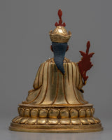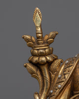 Intricately handcrafted in our workshop, the 9th Karmapa Wangchug Dorje Statue is full of unique Himalayan artistry. The statue is comprised of copper, which is then gilded in gold producing the final luster. This statue depicts the 9th Karmapa, one of the most revered spiritual leaders in Tibetan Buddhism, seated atop a moon disc lotus seat beside a fully blossomed Utpala flower. He can be seen performing the 'Karana Mudra' by his left hand.