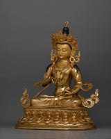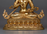 The Bodhisattva is seen in his customary placid and tranquil demeanor, seated on a moon disc lotus seat and in the lotus position. He has an upright vajra, which represents the impermanence and constancy of reality, in his right hand and a bell, which stands for emptiness and the sound of wisdom, in his left hand. The gold gliding on the statue's copper body gives it a brilliant luster, while the acrylic painting highlights and enhances the beauty of the statue.