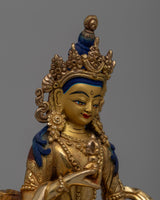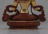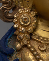 Immerse yourself in the peaceful air of our Dorje Sempa statue, a work of art that combines spiritual symbolism with artistic perfection. This monument, handcrafted with painstaking attention to detail, is a testament to Nepal's skilled craftspeople. The 24K gold gilding glows divinely, showcasing the delicate gold and acrylic paintings that decorate its surface. Its oxidized copper body, which has been antiqued, not only gives a timeless elegance to the monument but also represents the statue's connection to eternal spiritual traditions. With its magnificent posture and tranquil expression, this Dorje Sempa statue serves as a beacon of serenity and enlightenment in any space.