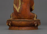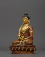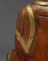 This hand-carved figure depicts the tranquility and wisdom of Amitabha Buddha, the representation of Infinite life. Standing 7.7" (Height) x 5.5" (Base) and weighing 1.12 kg, this statue is made of oxidized copper, gilded with 24K gold, and embellished with delicate gold and acrylic paints. This statue, crafted by skilled Nepalese artisans, depicts the eternal craftsmanship and spiritual dedication of Himalayan culture, making it an appropriate centerpiece for altars, meditation rooms, or religious home decor.
