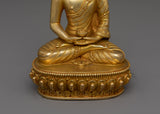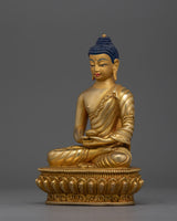 The Amitabha Buddha of Pure Land Buddhism Statue is a masterful representation of boundless light and compassion, which are important to Pure Land Buddhist practice. Handcrafted in Nepal, this sacred figure is made of copper, gilded in 24K gold, and delicately painted with gold and acrylic paints. This exquisite piece, measuring 6.7"/17cm in height and 4.5"/11.5cm at the base and weighing 0.820 kg, is the ideal addition to any meditation altar or spiritual space.
