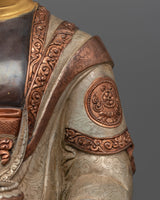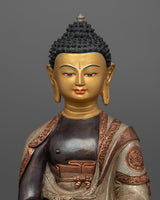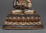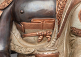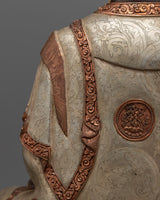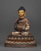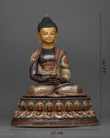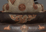 Delicately handcrafted in our workshop, the Amitabha Buddha statue is intricately designed with unique Nepali motifs. The statue is hand-carved out of oxidized copper, partially gilded in gold, and partially plated with silver giving it a dynamic beautiful look. In the statue, Amitabha Buddha is depicted serenely seated on a moon disc lotus, holding an alms bowl in each hand precisely in the position of Amitabha Buddha's signature gesture known as the "Dhyan Mudra." Acrylic paints have been skillfully used to elegantly accentuate his tranquil and unassuming facial expression. There are intricate carvings on the robe and the lotus seat done by our traditionally trained Vajrayana Artists.