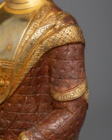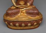 This sculpture, made of oxidized copper, exemplifies Buddhist art's everlasting elegance and history. It is beautifully gilded with 24K gold, highlighting the statue's spiritual essence and Amitabha's celestial luminosity. The gold finish not only increases the statue's visual attractiveness but also represents Amitabha Buddha's boundless light, illuminating the way to enlightenment for all beings.