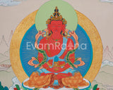 The thangka beautifully depicts Amitayus, filled with deep spiritual symbolism and meaning that truly enriches its presence. He represents serenity and a celestial aura, elegantly settled on a luminous lotus throne. The magnificent crown, adorned with five jewels, signifies his deep understanding and mastery of the five elements of existence. The sacred vessel he holds, filled with the nectar of eternal life, represents blessings of health and longevity. His swirling scarf illustrates the dynamic nature of life's energy. A brilliant halo encircles him, reflecting his boundless compassion and wisdom. This beautiful thangka radiates peace and joy, effortlessly transforming any sacred space into a haven of inspiration and hope.